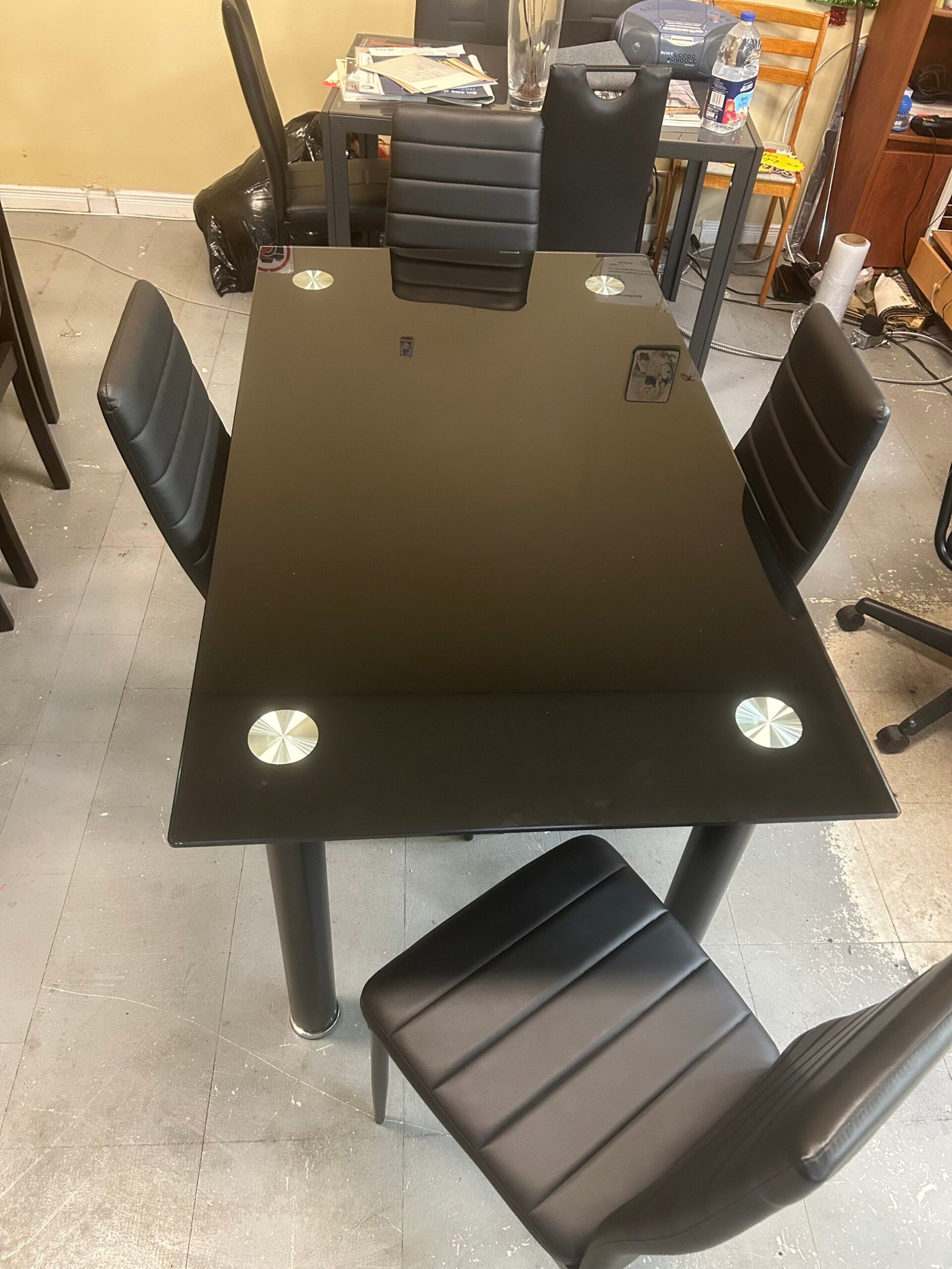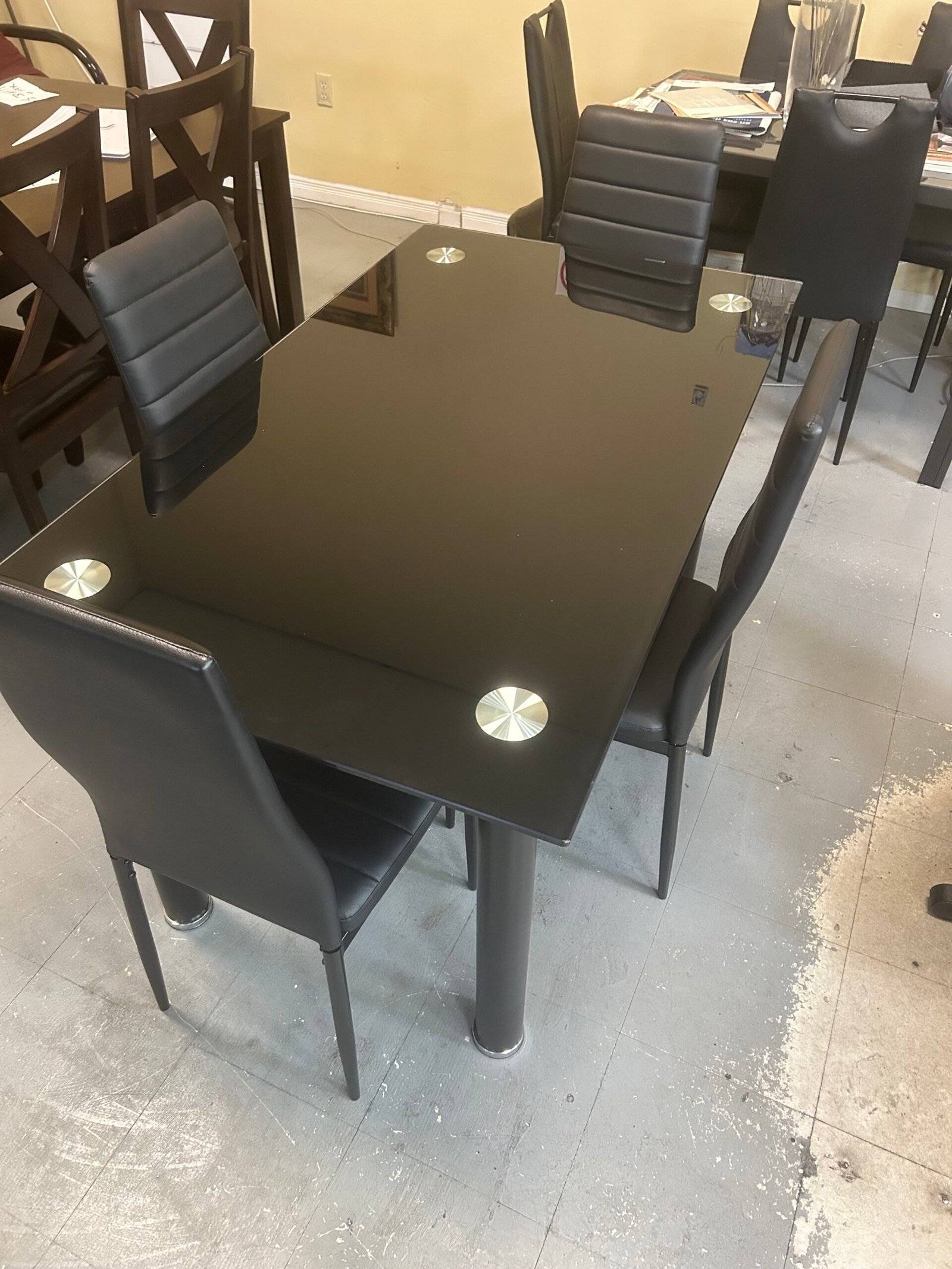 Elevate your dining experience with this modern black dining set, combining bold contemporary style with everyday functionality. The sleek black finish and durable metal frame create a striking centerpiece that enhances any dining room décor. Built for reliability, the table’s sturdy construction ensures long-lasting use, while the luxurious leatherette chairs provide both comfort and sophistication with their smooth black upholstery.